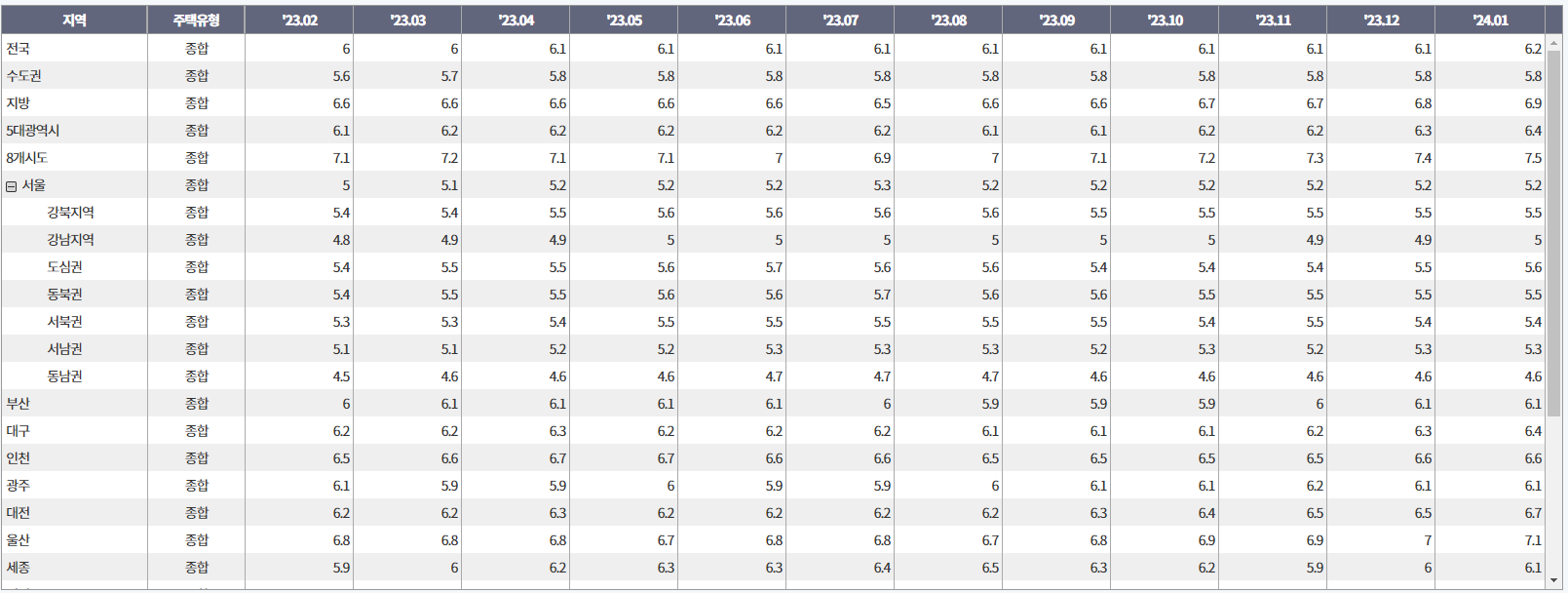 24년 1월 기준으로 전국은 6.2%, 서울은 5.2%, 수도권은 5.8%, 지방은 6,9% 입니다.